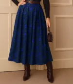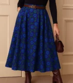 Elevate your style with this cobalt blue pleated midi skirt featuring green leopard print. High-waisted, elegant, and perfect for fall or winter looks.
