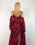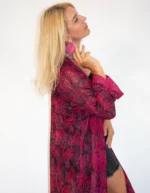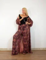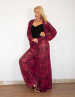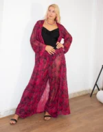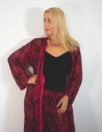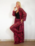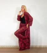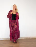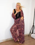 Sunset Mirage Set – Maxi Cardigan & Wide-Leg Pant: A bold harmony of color and flow. This coordinated set features a floor-grazing maxi cardigan and wide-leg pants, both adorned in a vivid mosaic of purples, pinks, and sun-washed orange.