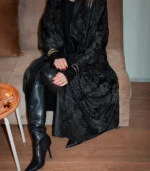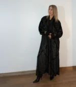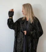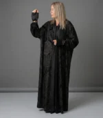 Black Luxury Kaftan – A flowing silhouette crafted with a glossy inner dress and a textured leaf-pattern cloak. Designed for elegance and comfort, this piece pairs beautifully with statement heels and a chic clutch. Perfect for evening occasions, cultural gatherings, or luxury events."