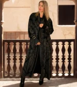 Levania Elegant Black Kaftan – Flowing silhouette with textured leaf-pattern cloak, paired with a sleek inner dress. A statement of luxury and timeless sophistication